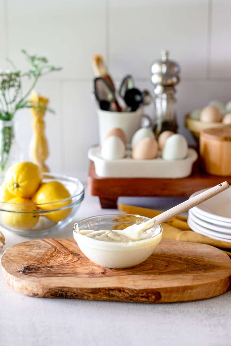 This easy mayo recipe goes well with a slice of Simple Sourdough bread, Sourdough Batard, or as a creamy slather on a Bacon Burger. And if you want to have your tastebuds singing, try some of this mayo on my zesty Mexican Street Corn.