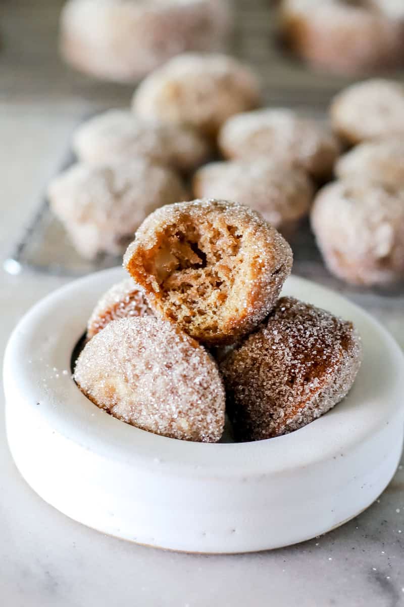 This old-Fashioned baked apple cider donut holes recipe is made in less than 30 minutes! They are baked in the oven, no frying required. And then instead of a sticky glaze, we are going to just dip in simple cinnamon and sugar. So easy.