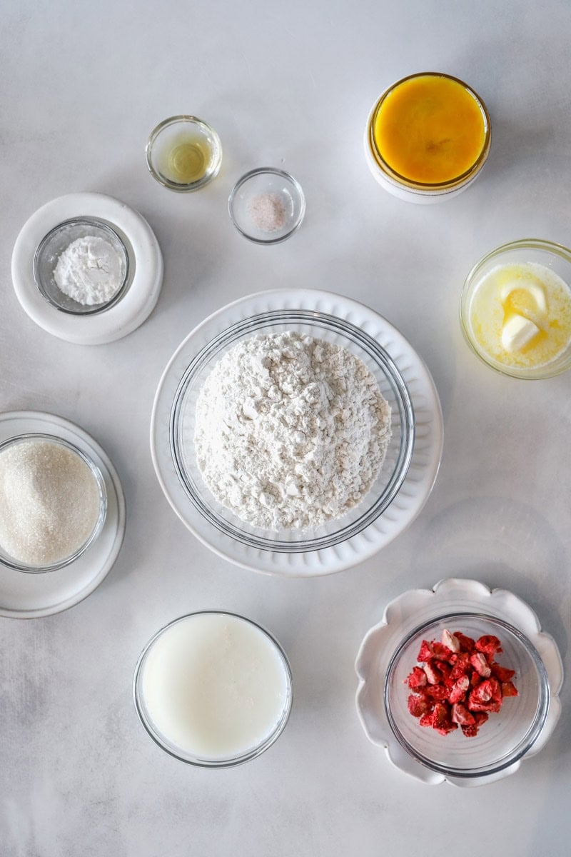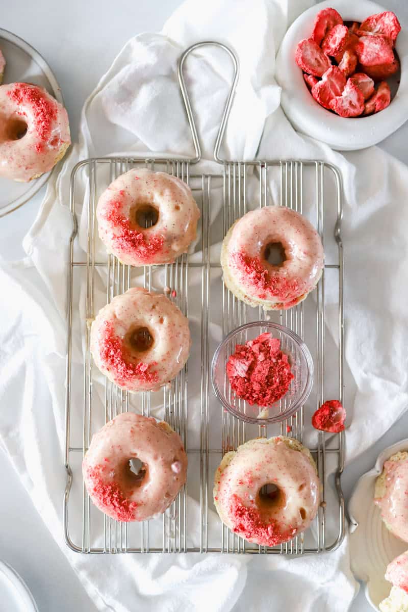 - Strawberries | Hear me out, it's worth finding freeze dried strawberries for this recipe. They are often in the snack section or can be purchased online. You could also use tiny pieces of fresh diced strawberries. Fresh strawberries can add moisture to the doughnuts, so the baking time may need increased slightly.