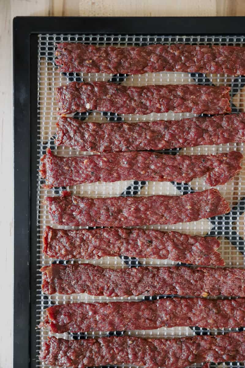 - Dehydrate the Jerky: Set your dehydrator to 150°F. Dry the jerky for 4-5 hours, checking periodically. The jerky is ready when it’s dry but pliable. When bent, it should flex and just barely begin to tear at the fibers.