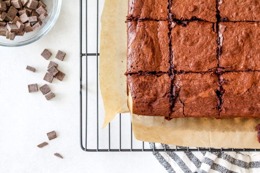 I baked this brownie in a 9X9 ceramic baker, which is the perfect size for a sixteen servings of brownies that are just the right height. I have also used an 8X8 square pan, and it basically comes down to personal preference. Just remember to adjust the baking time and choose how tall or dense you want the brownies to be. When I line my pan with parchment paper cut to size, my brownies come out cleanly every time! Given how often I bake, this is a huge win!