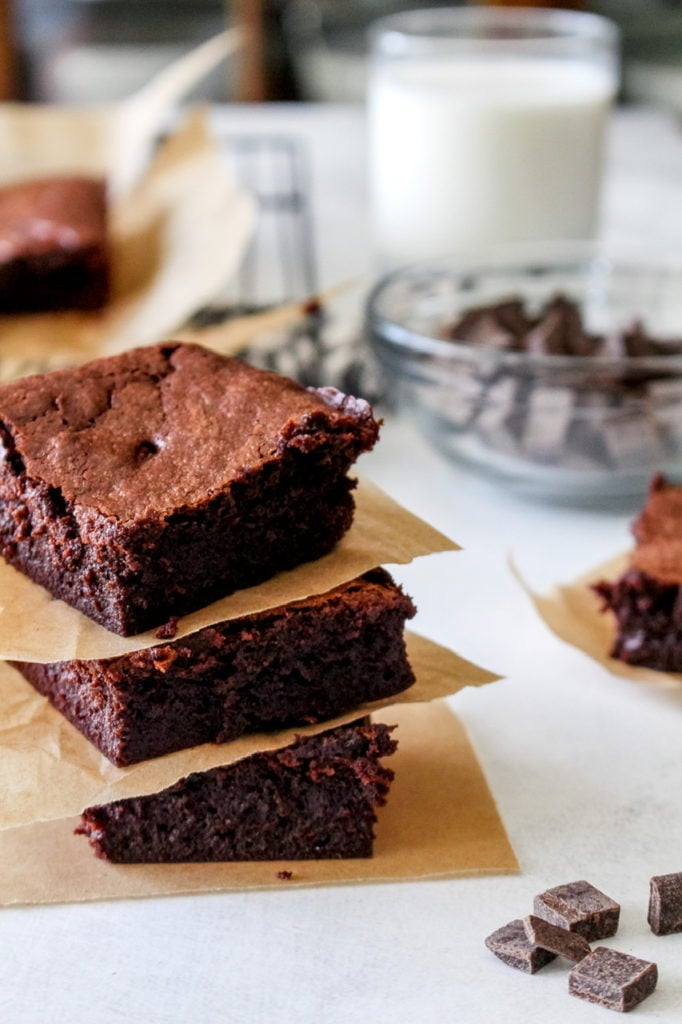 But, without a doubt, my favorite way to get my fix is in a chew, fudgy brownie. It’s more of an in-your-face-indulgence, and in my opinion, WAY better. It’s soft, pillowy, moist, and interestingly enough, you just need seven common pantry staples to make this delicious recipe. Plus, I get to make it with the highest quality ingredients and skip all of the preservatives that keep those popular mixes shelf stable for, well, years.