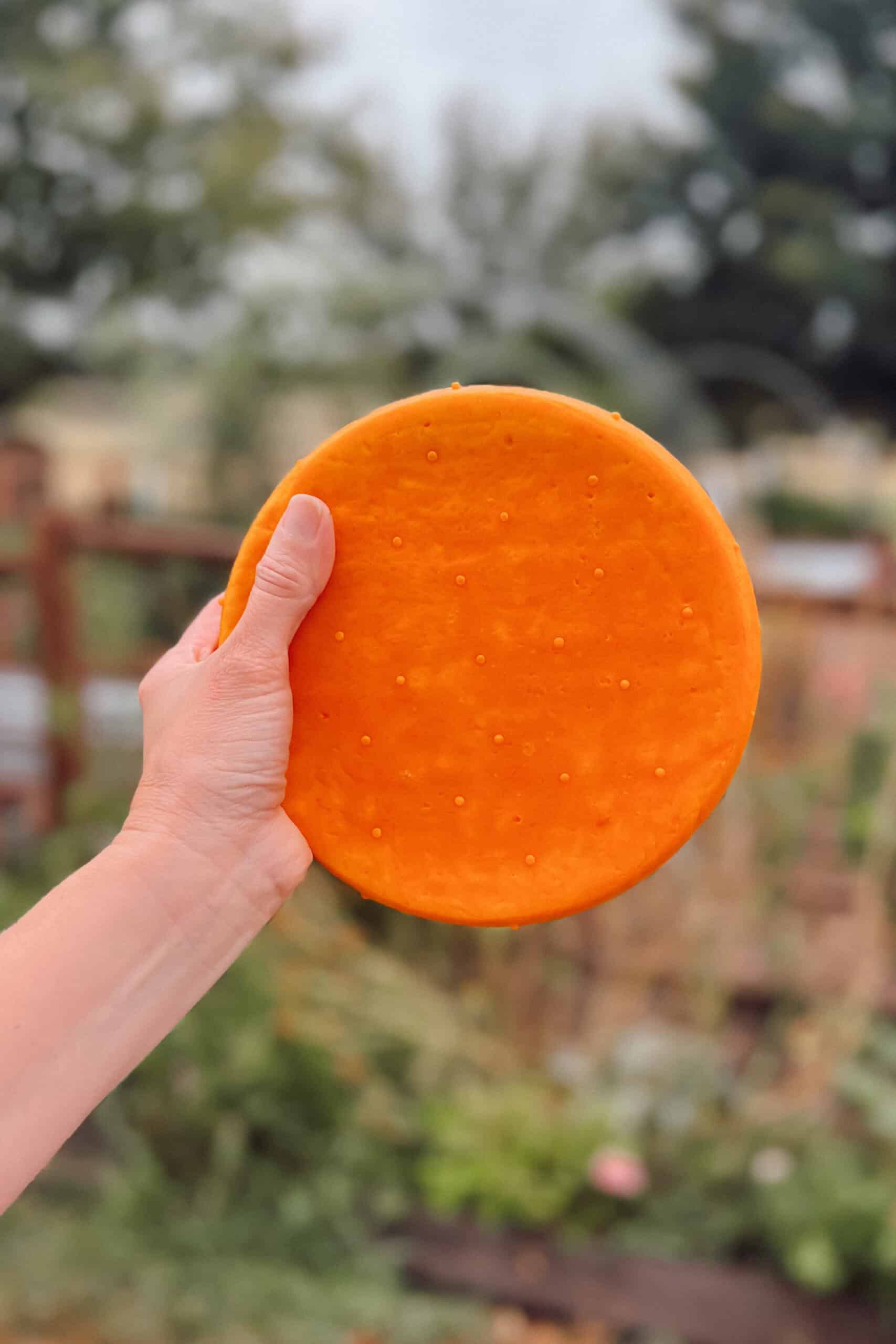 Tip: When drying your cheese on a wire rack, the moisture from the cheese can sometimes cause the rack to rust, leaving discolored spots on your cheese wheel. To prevent this, place a fresh coffee filter or paper towel between the cheese and the rack every time you flip it. This keeps the cheese clean and free from any unwanted marks!