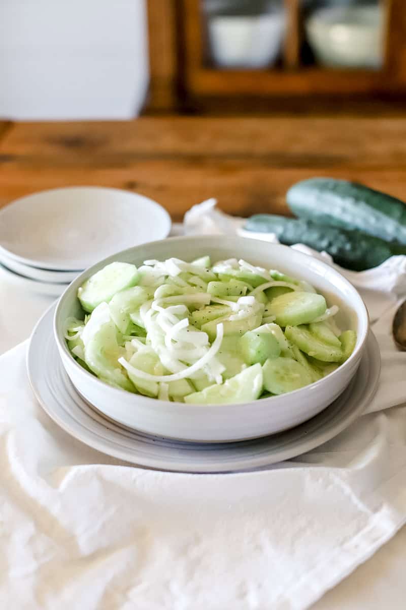 Cucumbers – Crisp cucumbers are key for making a refreshing cucumber salad. When you are planting your garden, choose a type of cucumber that is smaller than your hand and thinner than a banana. The larger the garden cucumber, the bigger the seeds. The type of fresh cucumber will determine how large it can grow before the flesh begins to taste bitter. I always remove the cucumber peels because they can add a tough texture to this salad that isn't our personal preference.