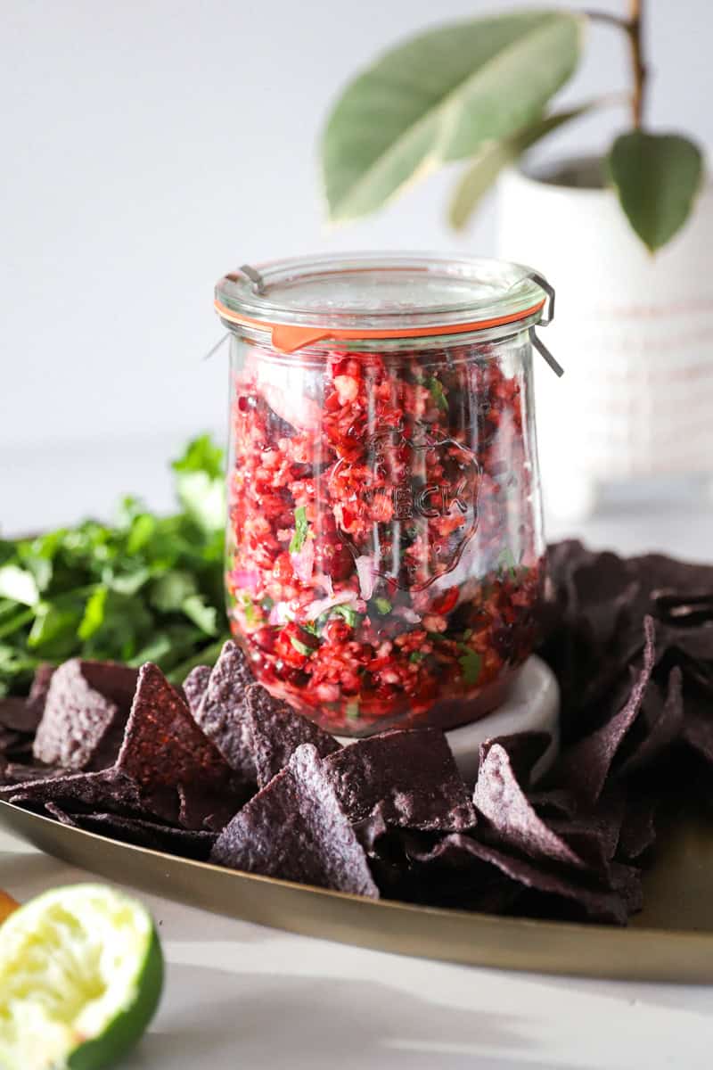 1. Cranberry salsa can be made ahead of time.  If you are really busy or traveling for the holidays, make this 1-2 days before the party.  Let it sit in the fridge and really release it's juices.  The only thing I've found when making this early is that the onion can get pretty strong.  I recommend adding everything BUT the onion and stirring it in fresh the day of serving. 2. It's fast! Spicy cranberry salsa took me about 15 minutes to make the first time I tried it, but most of that was searching for youtube videos about how to prep a pomegranate. Now that I have that figured out, I can make this whole salsa using my blender (or food processor) and veggie chopper. 3. This might be a little superficial, but it truly is a gorgeous salsa. The deep shades of red and purple, splashed against the deep green accents... it looks ultra fancy! 4. Make this a sweet or mild salsa. This actually doesn't have to be a spicy salsa. Leave out the peppers, cilantro and onion, and pepper and make this a sweet salsa and add in a tiny splash of orange juice. Serve it sweet! Some recipes recommend adding a cup of sugar, but I think that is too much. I'd double up on the honey or maple syrup first and see how that goes. 5. If you are a family who loves spice, add more jalapeno peppers. Kick it up a notch! I haven't tried it yet, but I plan on making a hot version in the near future for tailgate parties that is spicy and has double the peppers and I'll toss in a red bell pepper for a great addition to this robust fresh salsa.HOW TO STORE CRANBERRY SALSA