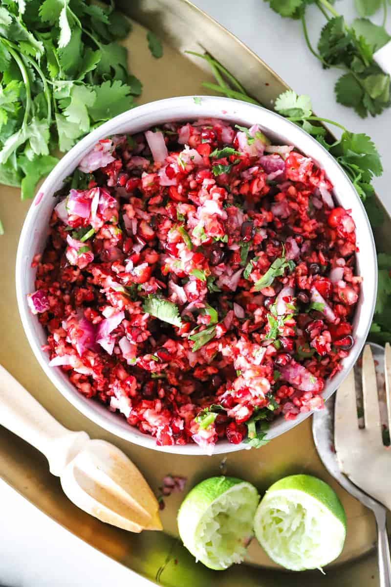 The only downside that I could come up with for making this festive cranberry salsa is that you will have to run to the grocery store. Or at least most of us don't keep pomegranates and fresh cranberries on hand! Other than that, this really is the perfect complimentary bff to traditional cranberry sauce.