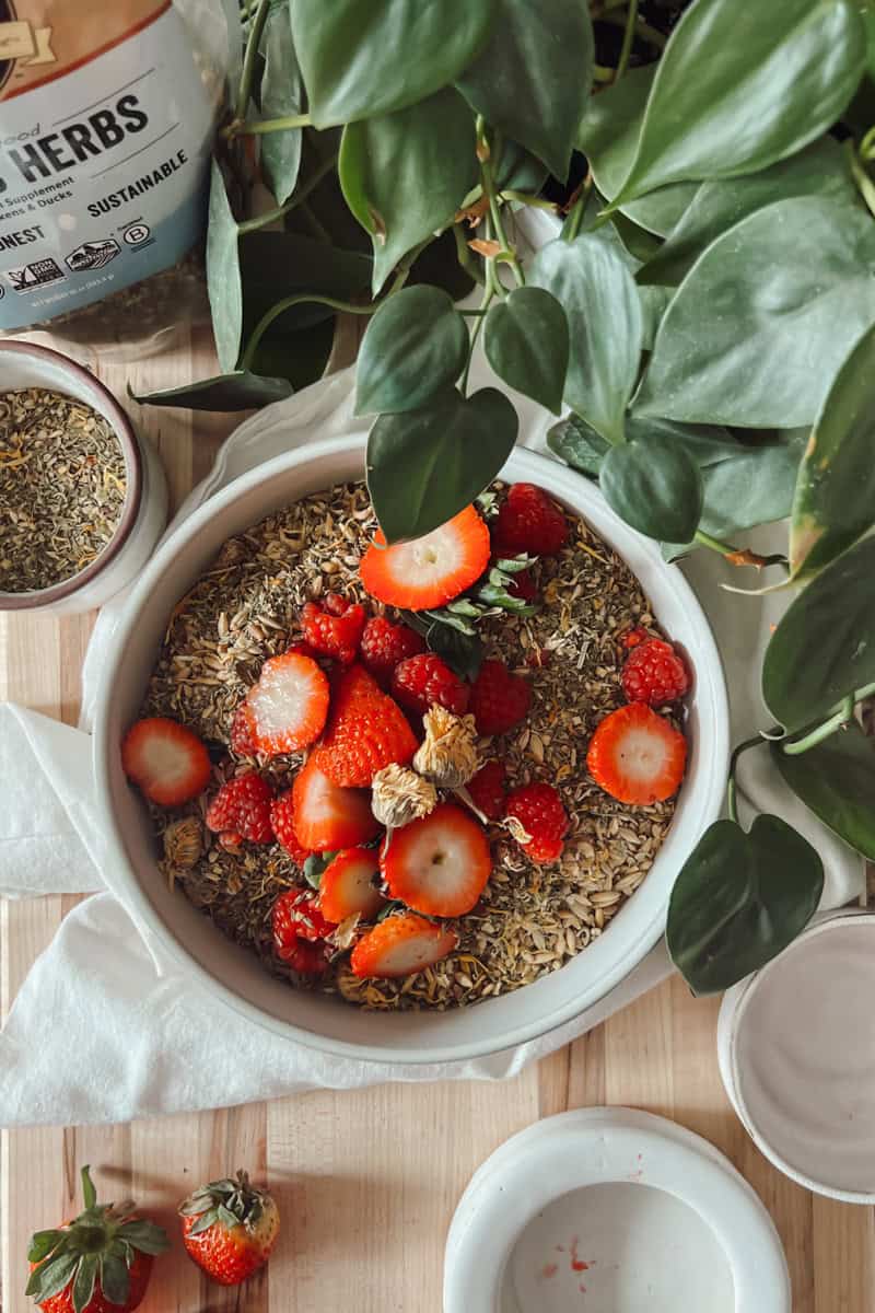 - Herb Treats: Mix herbs with other favorite treats. For example, blend chopped herbs with scrambled eggs or mix dried herbs with a bit of scratch grain. I also like to make chick-cuterie boards with chicken appropriate snacks and herbs! See the picture below for an idea of what it could look like. I've added strawberry tops and raspberries!