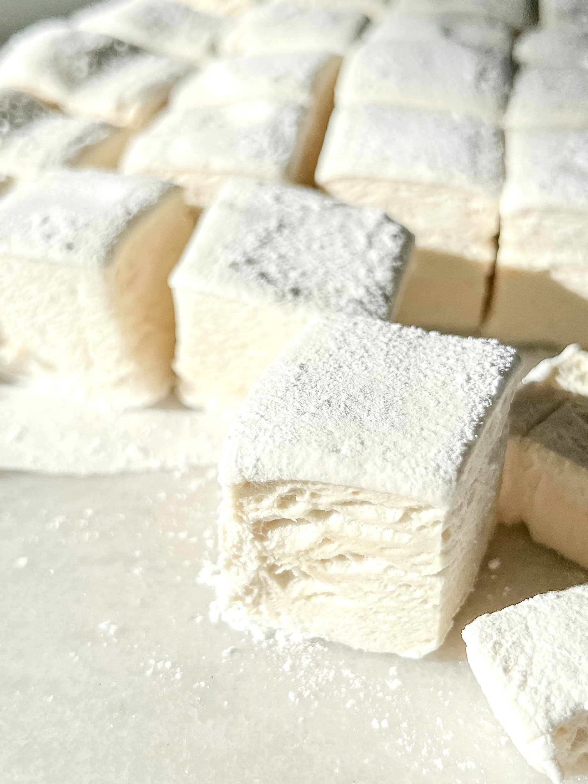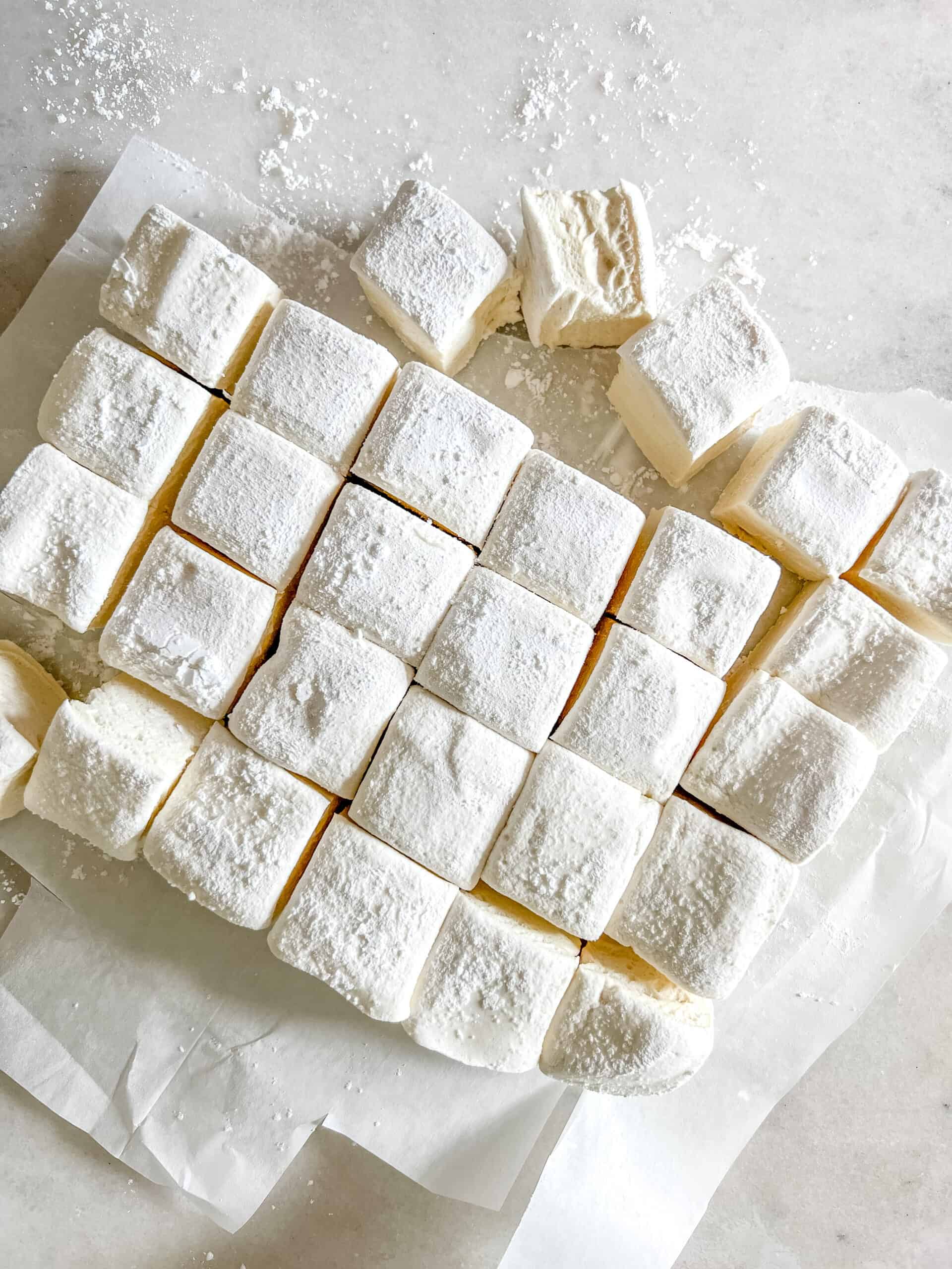 When the marshmallow has had time to set, remove the parchment paper and invert the marshmallow onto a cutting board that has been dusted with more powdered sugar mix. Use a sharp knife to cut the marshmallow into squares. Add more powdered sugar mix as necessary to prevent sticking.