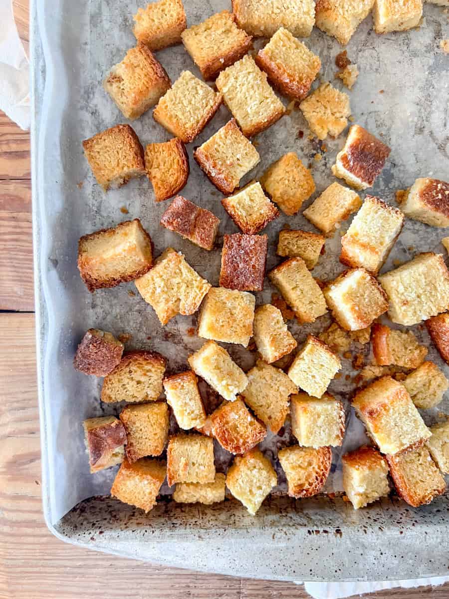 It may seem easier to place bread cubes on the same baking tray, but it is very important to only have a single even layer of bread cubes on each rimmed baking sheet. Overcrowding them will result in uneven browning, over done croutons, and soggy croutons.