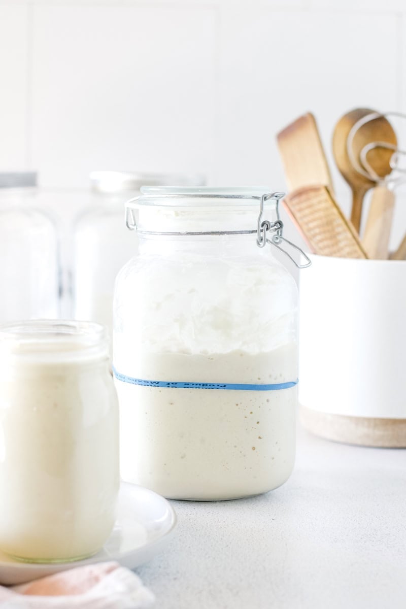 - A large glass jar | The sourdough starter will grow best in a spacious jar with a breathable lid. The glass allows us to easily see where it is at in the fermentation process. The jar needs to be big enough that the flour and water mixture can easily double (or more) without running out of room.