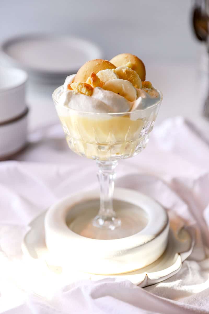 This old fashioned banana pudding can be served and stored in pint or jelly mason jars. Simply put vanilla wafers and bananas on the bottom and layers of creamy vanilla pudding on top. I still like to top it with whipped cream.