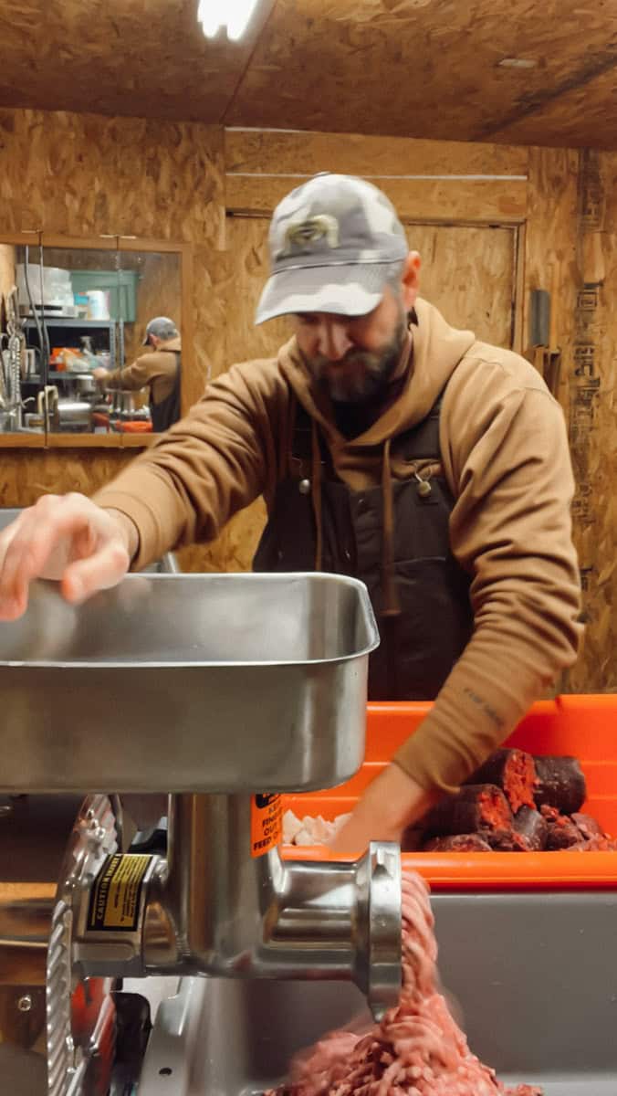 Ensure venison and pork are near freezing temps but still pliable.