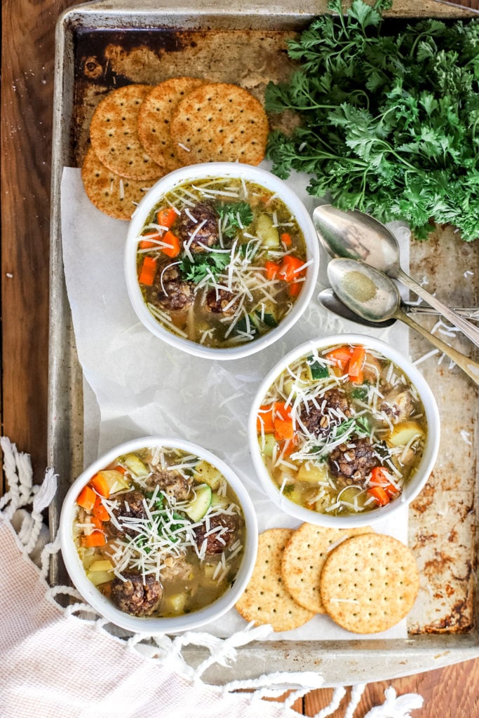 This soup is nearly keto, but not quite. Swap out the bread crumbs in the meatballs for crushed pork rinds or 1 cup of almond flour.