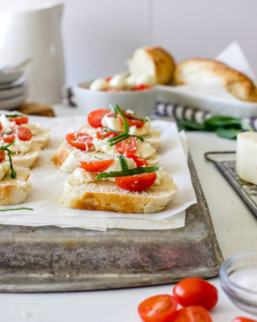 When I bite into these simple crostinis, it makes me feel like fresh garden vegetables are vine-ripe and here to stay. To make these little mini sandwiches, I used my basic sourdough bread recipe and shaped it into two long baguettes. I used leftover Caprese Salad for my toppings! From there, I add a torn mozzarella ball and several fresh cherry tomatoes. Once it gets a little olive oil drizzle, I bake it until the cheese is bubbly and lightly browned. Top it with fresh ground pepper, sea salt and torn basil. YUM