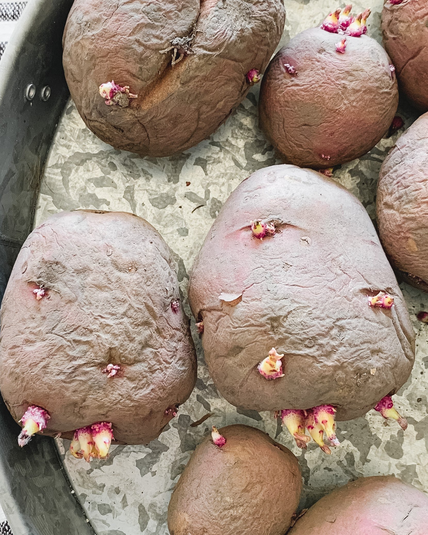 I'm going to be honest, potatoes tend to sprout fairly quickly at hour house. Even the ones from the store will send off shoots within a month or so of living in my pantry. One lesson that I learned the hard way was that a potato that chits too early will not grow a thriving potato plant.