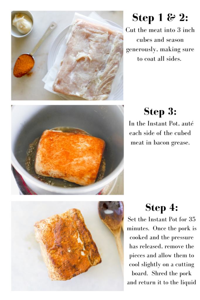 - My Instant Pot insert can be used to sauté. If yours has this feature, I recommend heating the bacon grease and sautéing the seasoned pork cubes for about 3-4 minutes per side. Cooking the pork loin in smaller pieces and browning the edges allows the meat to cook faster for a fork tender pulled pork.