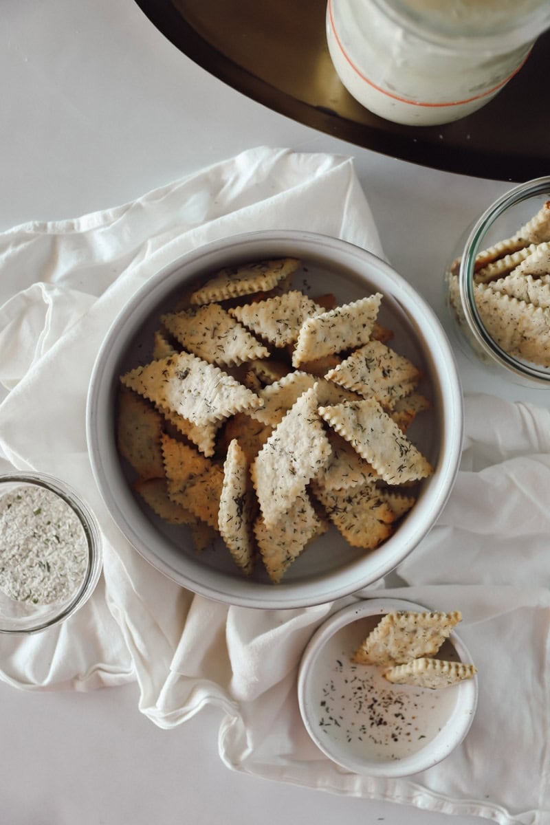 - Sprinkle the crackers with coarse salt, pepper and any additional seasonings you desire. I like to sprinkle with a little extra dried dill or parsley.