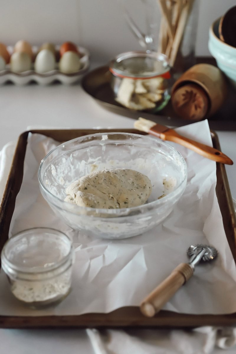 - In a large bowl, combine the flour, sourdough starter, ranch seasoning, melted butter and salt. Start by using a wooden spoon, then use your hands to work the dough into a ball. It will start out messy, but once the ingredients blend, it will be a soft and pliable dough. Flatten the ball into a rectangular disc.