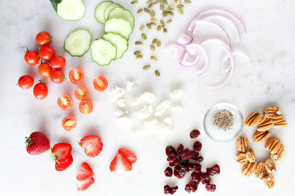 One of my favorite things about creating salads is how incredibly easy it is. The basic recipe comes together in under 10 minutes. No need to heat up the house by running the oven or exhaust yourself by making a million dirty dishes! PRESS THIS EASY BUTTON and you will never go back. These quick meals will have your family devouring fresh fruits and vegetables in no time!