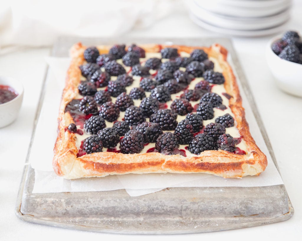 This puff pastry recipe can be made with any berry! Raspberries, strawberries, blueberries… both would be delicious! Simply substitute the pint of blackberries for whichever berry is available. This would also be a great dessert to take to a Fourth of July or Memorial Day picnic with alternating red and blue berries. America the beautiful, but in patriotic berries!