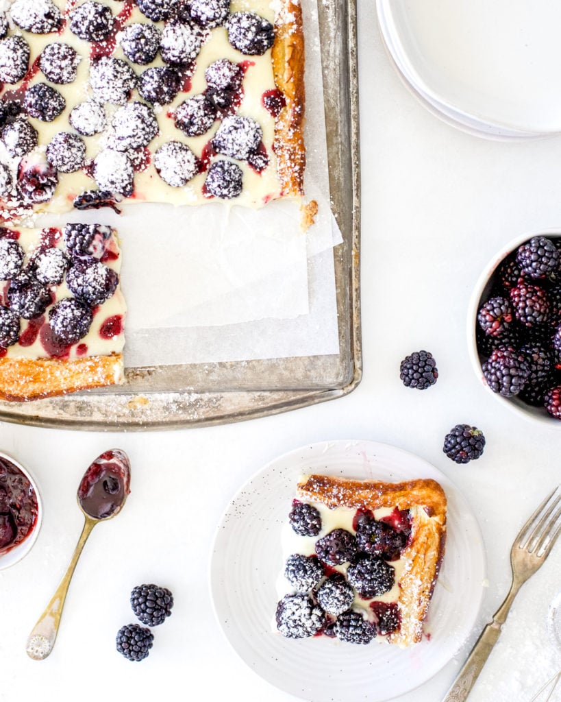 You guys, this blackberry cheesecake tart is SO EASY to make! I even shortened the prep time by hours when I decided to go ahead and use a store-bought puff pastry crust. This one is too good to wait for, you’ll see what I mean!