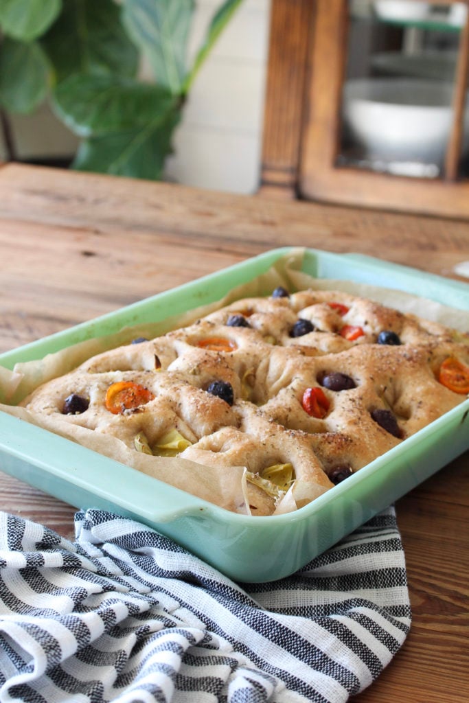 - Now we are ready for fermentation!  Line a 9X13 pan with parchment paper and drizzle with olive oil. TIP: Sometimes I skip the parchment paper and just generously oil the pan with olive oil, but there will be areas that stick to the dish if you skip it.  Shape the dough to mostly cover the bottom of the pan.  Cover with a tea towel and refrigerate for 2-12 hours.
