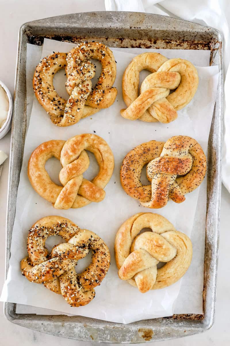 - When I am craving the flavorful punch of Everything But the Bagel seasoning, I make my plain pretzels and sprinkle them generously with the seasonings after the egg wash and before baking. They are so tasty when served with softened cream cheese!