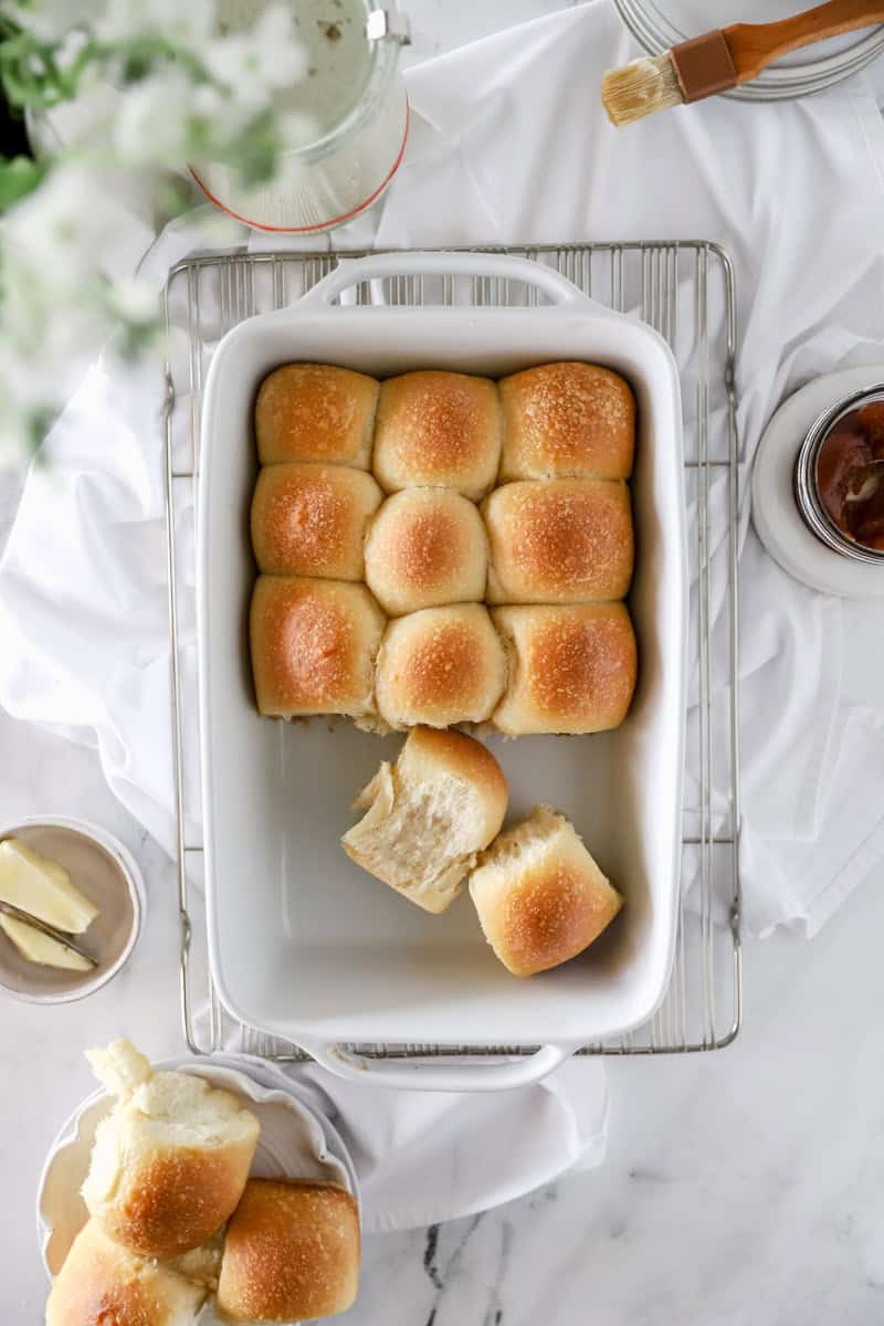 - Divide the dough into 16 pieces and shape rolls. Place the rolls in a greased 9X13 baking dish and let rise for 1 hour. Rising time will vary depending on the temperature of your kitchen.