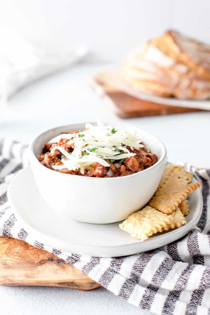 We like to eat this chili with a sprinkle of shredded cheddar cheese and a little pinch of cilantro or parsley. Serve it with a batch of Homemade Sourdough Crackers!
